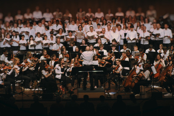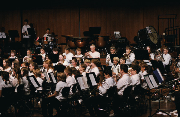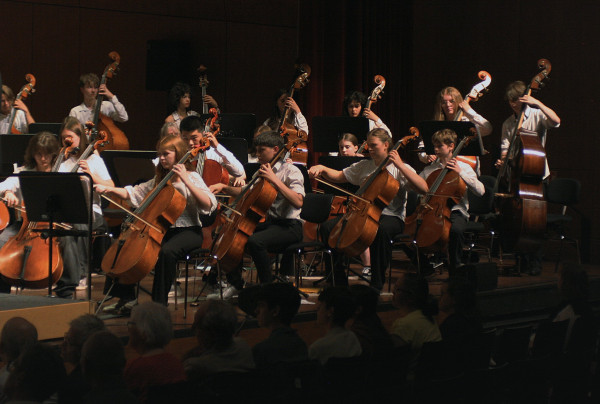 Zu Beginn des Konzerts spielten die IKG-Brass, die JuniorBrass und die Bläserklasse 5 unter Leitung von Johannes Popp eine breite Palette von pfiffigen Stücken und mitreißenden Songs. Höhepunkt waren der Banana Boat Song und Y.M.C.A., bei dem das Publikum die passenden Partytanz-Bewegungen mitmachte. Nach zwei Stücken gespielt von den Bläsern und den Juniorstreichern gemeinsam spielten die Juniorstreicher mehrere Stücke von witzig bis rockig, was nicht zuletzt an der abwechslungsreichen Schlagwerkbegleitung lag. Bei zwei Stücken wurde das Publikum mit vorher ausgeteilten Tröten in das musikalische Geschehen einbezogen, sodass hier tatsächlich fast 1000 Menschen gemeinsam musizierten. Auch die Jüngsten, die Streicherklasse 5, glänzten mit der Melodie von Zug der Zwerge.