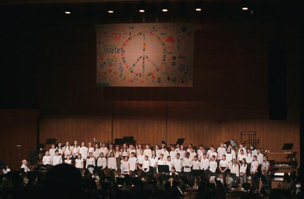 Beeindruckende Stimmkultur und gute Textverständlichkeit zeigte daraufhin der PapriCHOR bei einem ungarischen Lied und dem Song Deutsche Bahn von den Wise Guys. Richtig anspruchs-voll wurde es dann mit dem älteren CHORka:in vor allem bei dem diffizilen und witzigen Arrangement der Vogelhochzeit. Hier zeigte sich echte Chorkultur! Aber es wurde auch populär gesungen, vor allem mit Super Trouper von ABBA. Die größte Chorgruppe, die Singeklassen 5, bot eine farbenreiche und klangvolle Urwaldzsenerie in P. Schindlers Urwaldsong und danach Udo Lindenbergs Wir ziehen in den Frieden, das zu einem beeindruckenden Friedensapell wurde; ein wunderschön gemalten Friedensplakat wurde hochgezogen und im Publikum winkten die Handylichter. Alle Chöre wurden geleitet und begleitet von Teresa Nann und Ulrich Krämer.