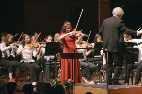 Nach der Pause wurde es instrumental. Die Abiturientin Carissa Marcu glänzte beim anspruchs-vollen Violinkonzert von Jean-Baptiste Accolay. Danach spielte das Sinfonieorchester den ersten Satz aus Schuberts 3. Sinfonie. Es zeigte sich, dass das IKG inzwischen mit einer vollen sinfonischen Besetzung aufwarten kann, die solche Literatur (für schulische Verhältnisse) angemessen spielen und differenziert interpretieren kann. Das mit über 100 Spielern "Große Schulorchester" spielte anschließend Schostakowitschs berühmten "Walzer Nr. 2", eine emotionale und aufwühlende Bearbeitung von Tschaikowskis "Romeo und Julia" sowie das rhythmisch herausfordernde Mission Impossible, mit einem großen Saxophonsolo, gespielt von Jette Jeurissen. Die Orchester wurden dirigiert von Wolfhard Witte.