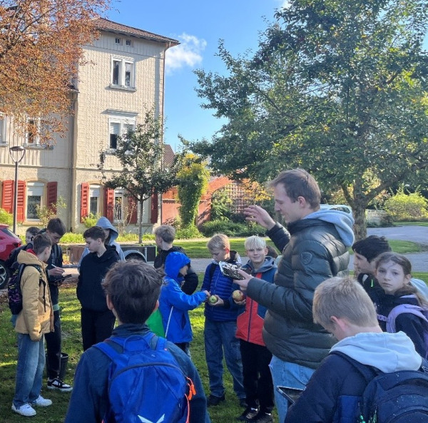 Die Schülerinnen und Schüler wurden vom ehemaligen IKG-Schüler Fabio Ruoff, mittlerweile Student der Agrarwissenschaften an der Uni Hohenheim, begrüßt. Fabio gab wertvollen Input zur Geschichte der Pomologie, der Bedeutung von Streuobstwiesen und dem Erhalt alter Apfelsorten. Neben den theoretischen Einblicken bekamen die Schülerinnen und Schüler auch praktische Tipps zur sachkundigen Bestimmung von Apfelsorten, sowie der Kreuzung, Züchtung und Vermehrung von Apfelsorten.