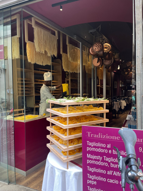 Gegen Mittag ging es mit dem Zug nach Lucca. Dort stellten die Schülerinnen und Schüler auf kreative und unterhaltsame Weise die wichtigsten Sehenswürdigkeiten vor und bestiegen gemeinsam den begrünten Guinigi-Turm. Anschließend erlebten sie eine kulinarische Unterrichtseinheit, in der sie in einem traditionellen Restaurant frische Pasta bestellten und genossen.