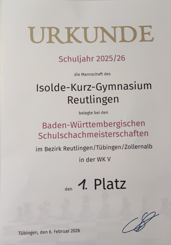 Am 6.2.2026 war es endlich soweit, die Bezirksmeisterschaften im Schulschach fanden in Tübingen am Kepler-Gymnasium statt. Das IKG ging mit vier Schülern +Betreuung an den Start. Da es zu wenige Teilnehmer gab, wurden alle Mannschaften von allen Altersklassen in ein Turnier gemischt, deshalb gab es auch stärkere Gegner.